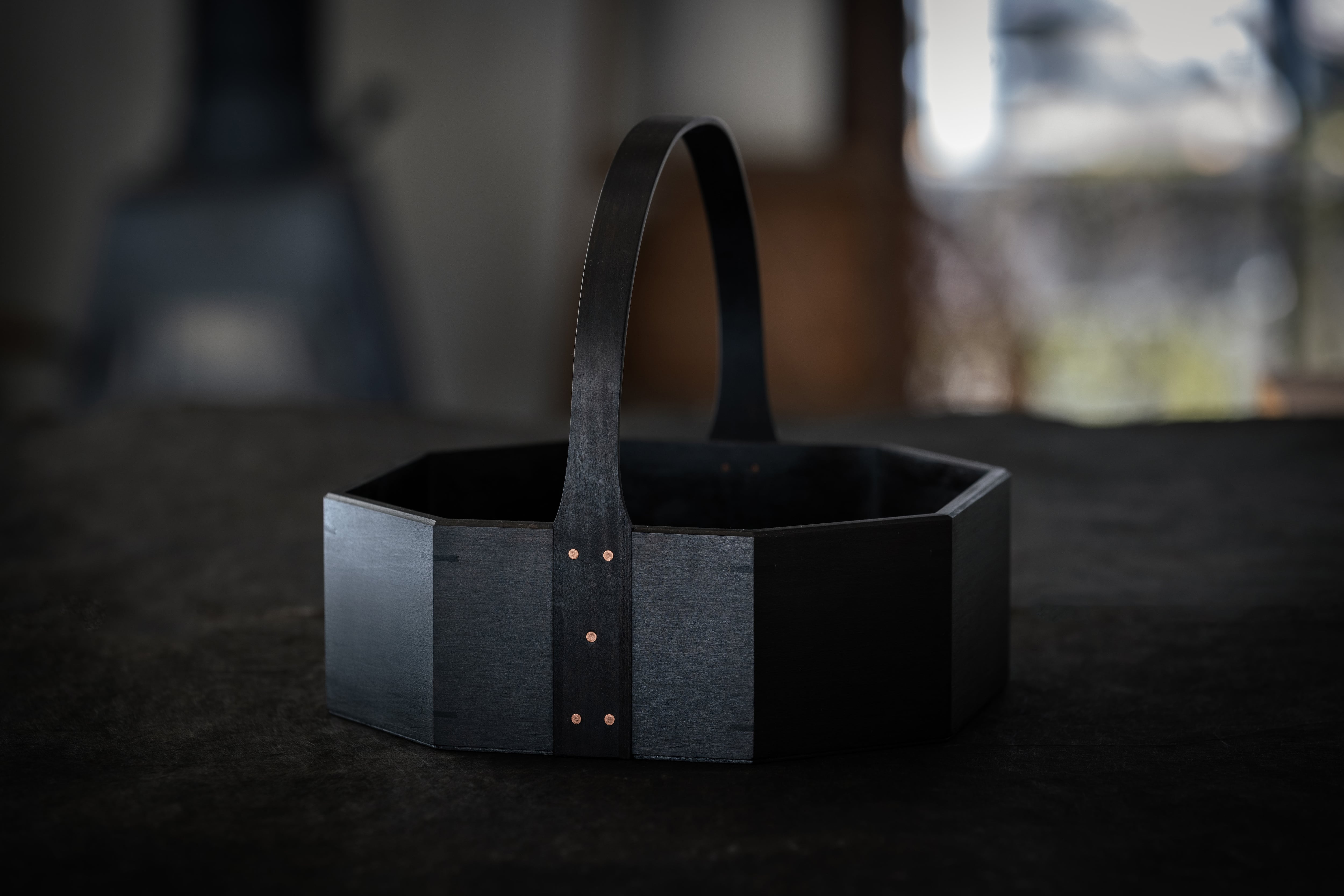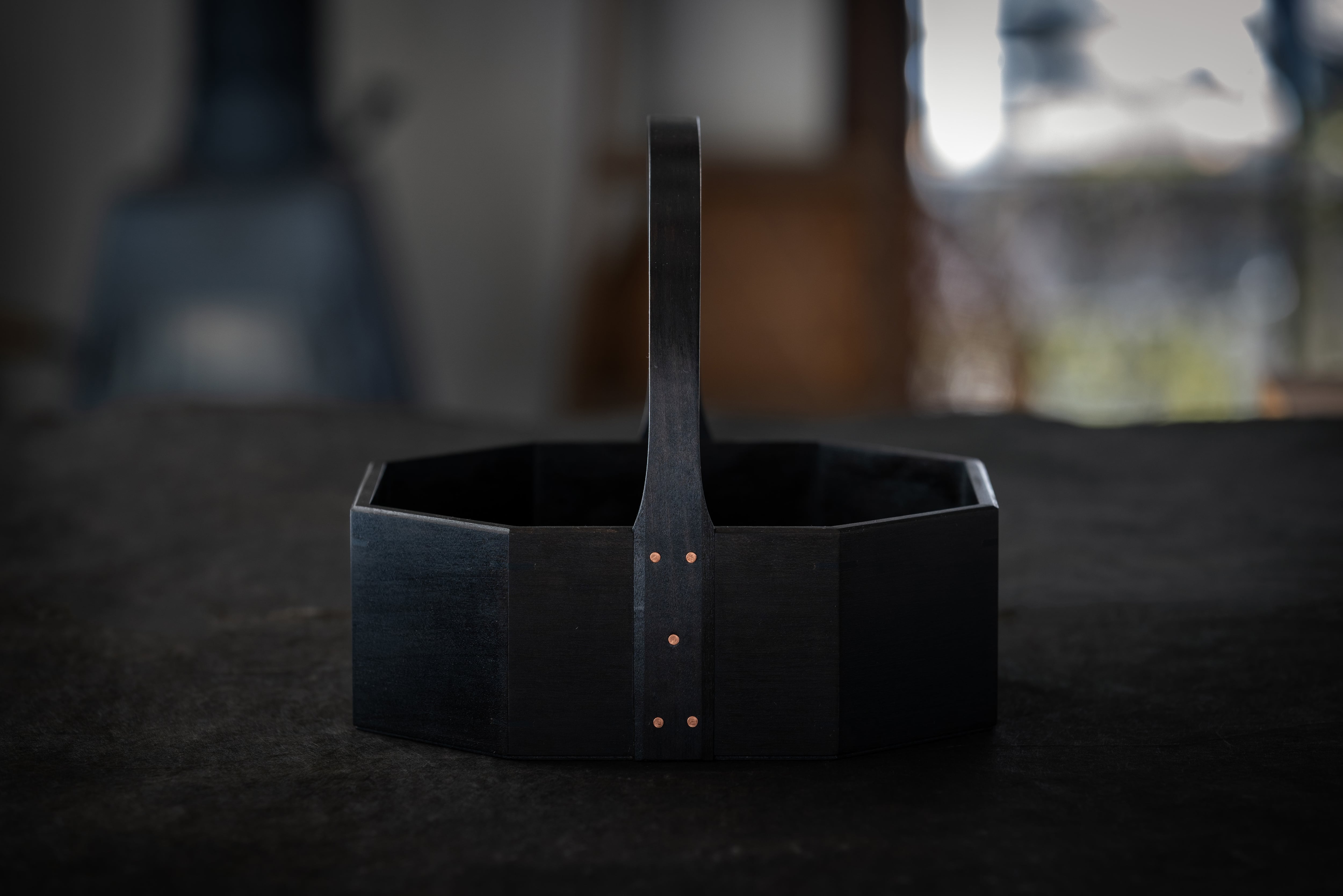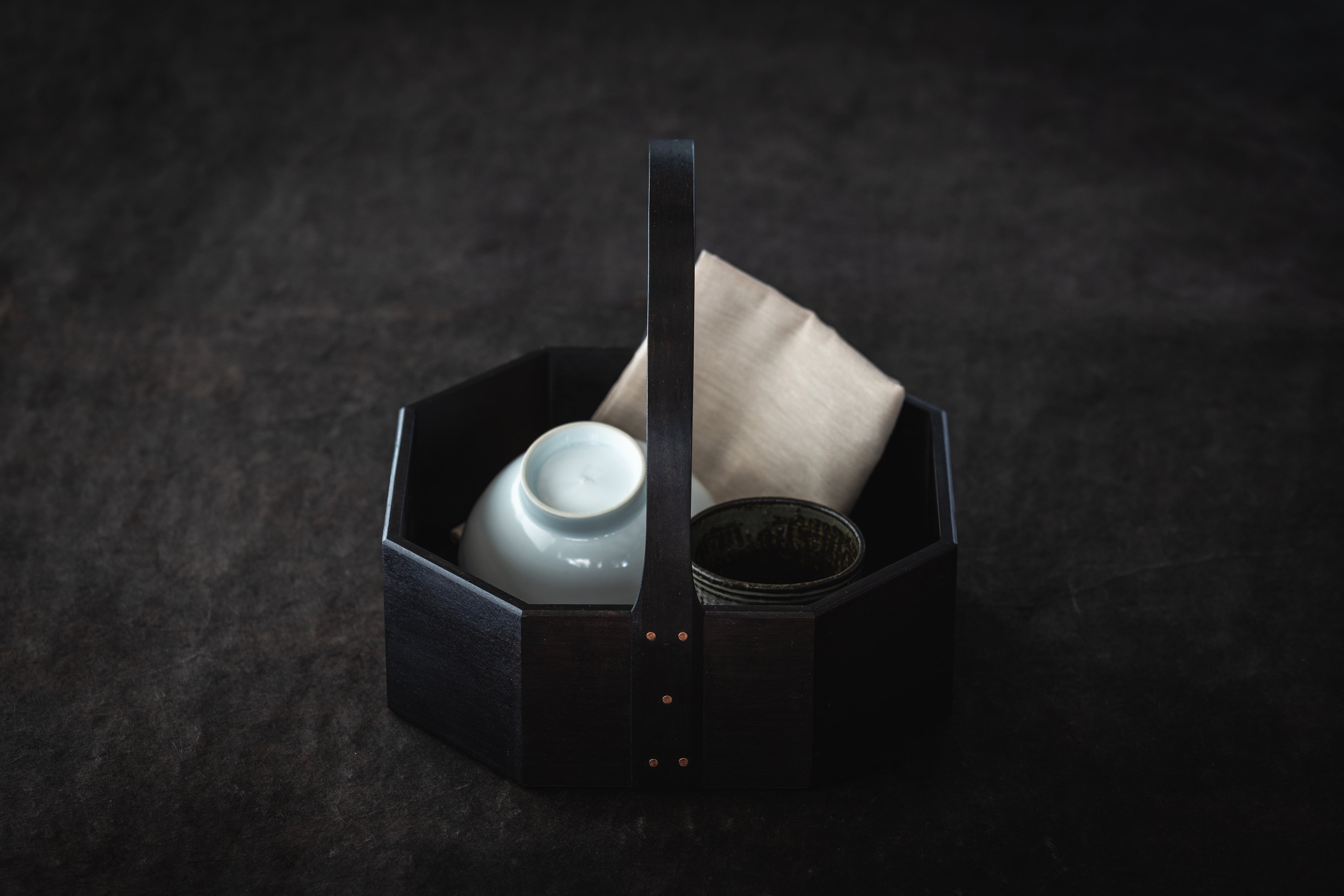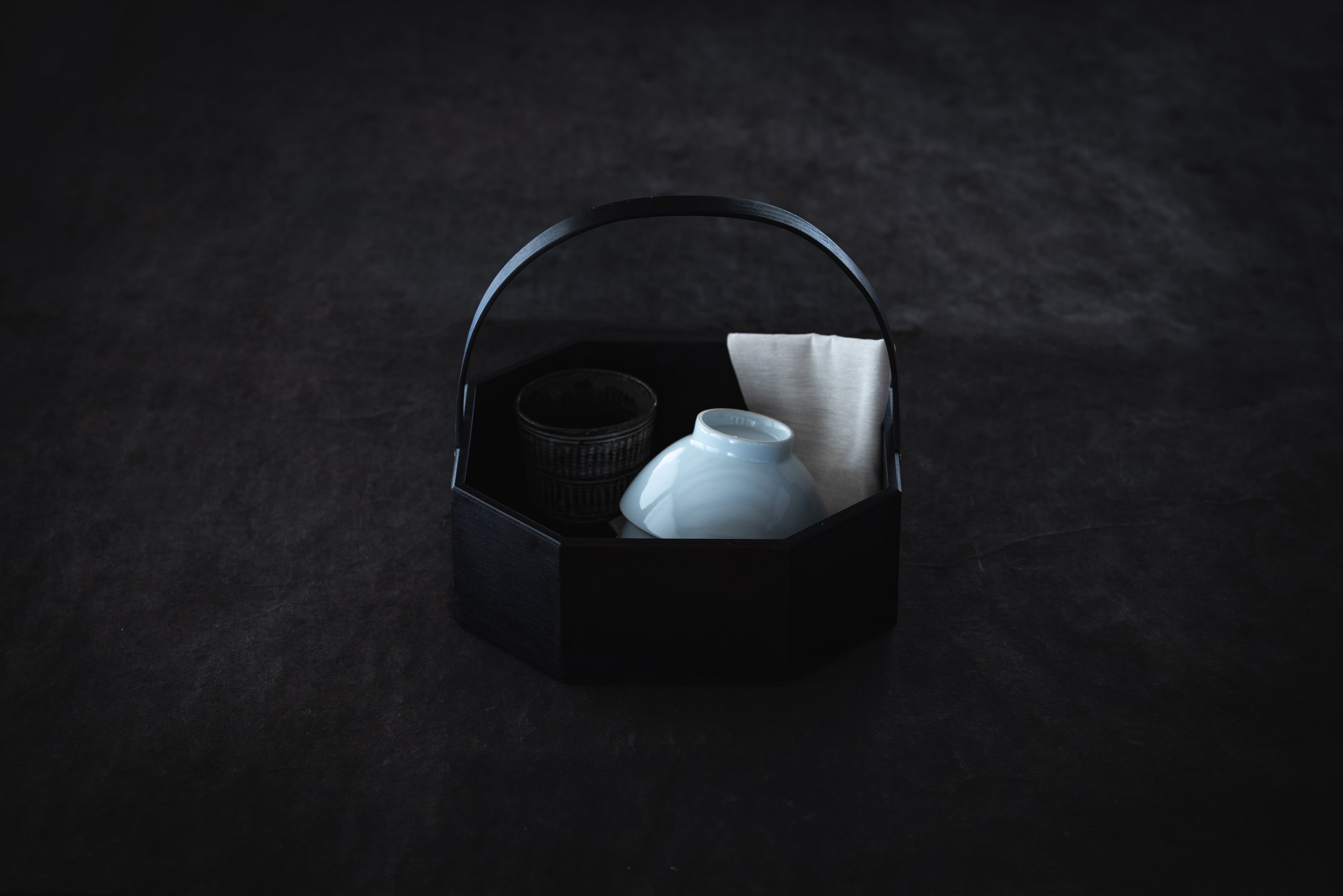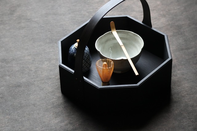 毎日使うお茶や珈琲の道具をまとめて置いたり、裁縫道具、事務用品など細かなものの整理に。持ち運びに便利な持ち手付のキャリーボックスです。八角はお茶の時間を楽しむための道具をイメージして制作したものです。輪になってお茶をする時間や、丸いテーブルなどにも合うデザインとしています。